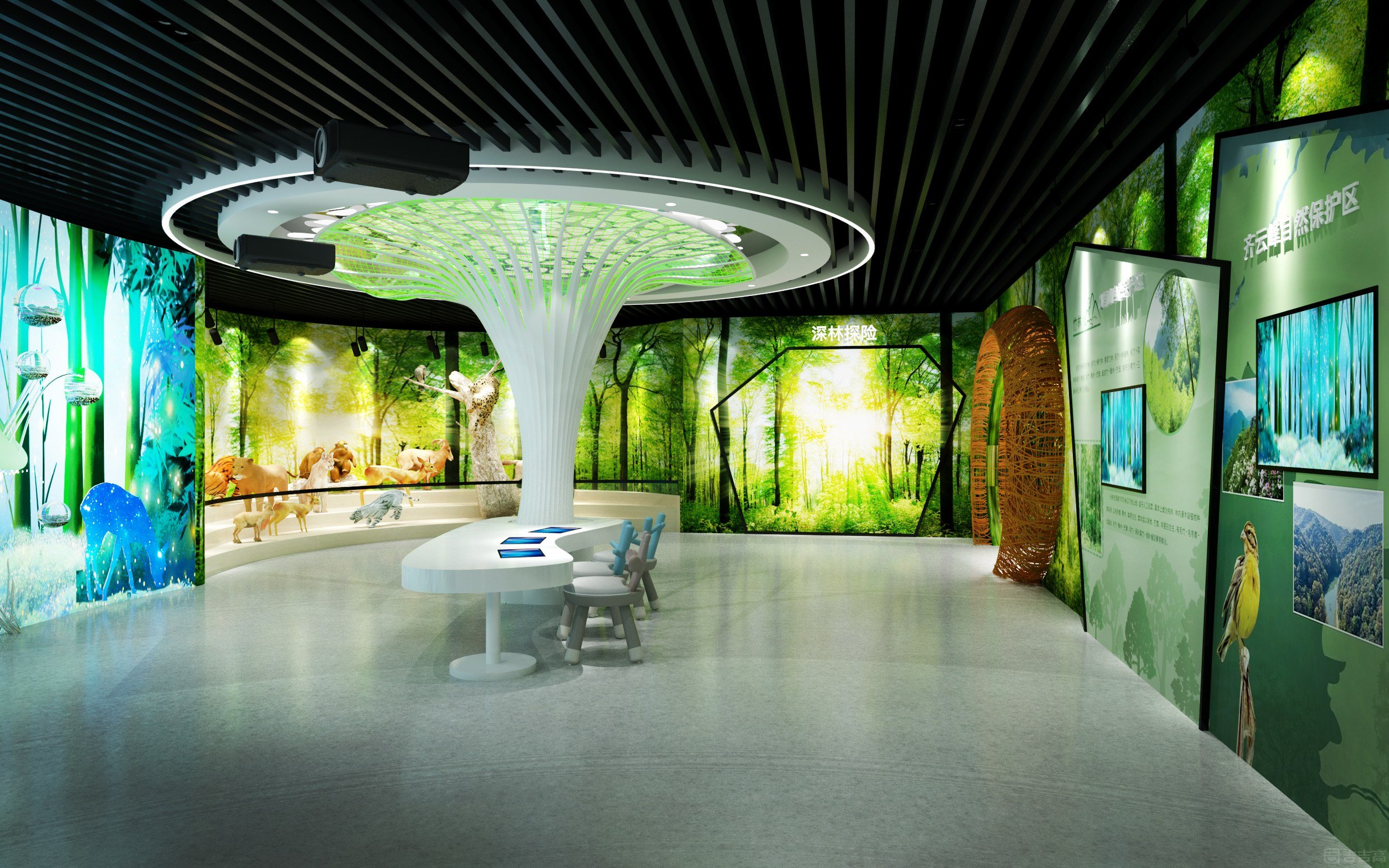 湖南桂東青竹屬亞熱帶季風性濕潤氣候,林地占比達 92.12%,森林保持原生態(tài),野生動植物種類繁多,條生物多樣性件好,是國內(nèi)既有國家級自然保護區(qū)又有國家級森林公園的唯一一個縣,獲得了“省級生態(tài)文明建設示范縣”生、“中國最佳態(tài)旅游示范縣”等榮譽稱號。該館以樹立和踐行綠水青山就是金山銀山為理念,以“我與自然和諧共處”為主題,通過“布局生態(tài)化、生態(tài)故事化、故事體驗化、體驗心靈化、心靈未來化”的展陳主線,分“總體概況、南嶺探秘、千年鳥道、道地藥材、都市自然、生態(tài)藍圖”六大展陳板塊,伴以認知式觀賞、互動式參與、沉浸式體驗等方式展現(xiàn)生態(tài)多樣性。